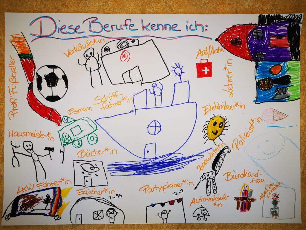 April 2023 Bei den Kindern in unserem Kita Brückenjahr dreht sich gerade alles rund um Berufe und Berufswünsche. Zu der Frage „Welche Berufe kennst du?“ überlegen sich die Kinder, welche Berufe sie von ihren Eltern oder aus dem Bekanntenkreis kennen. Jeder malt einen oder mehrere Bilder oder Symbole, die für den Beruf stehen. Es kommt eine große Sammlung mit vielen unterschiedlichen Berufen zustande.